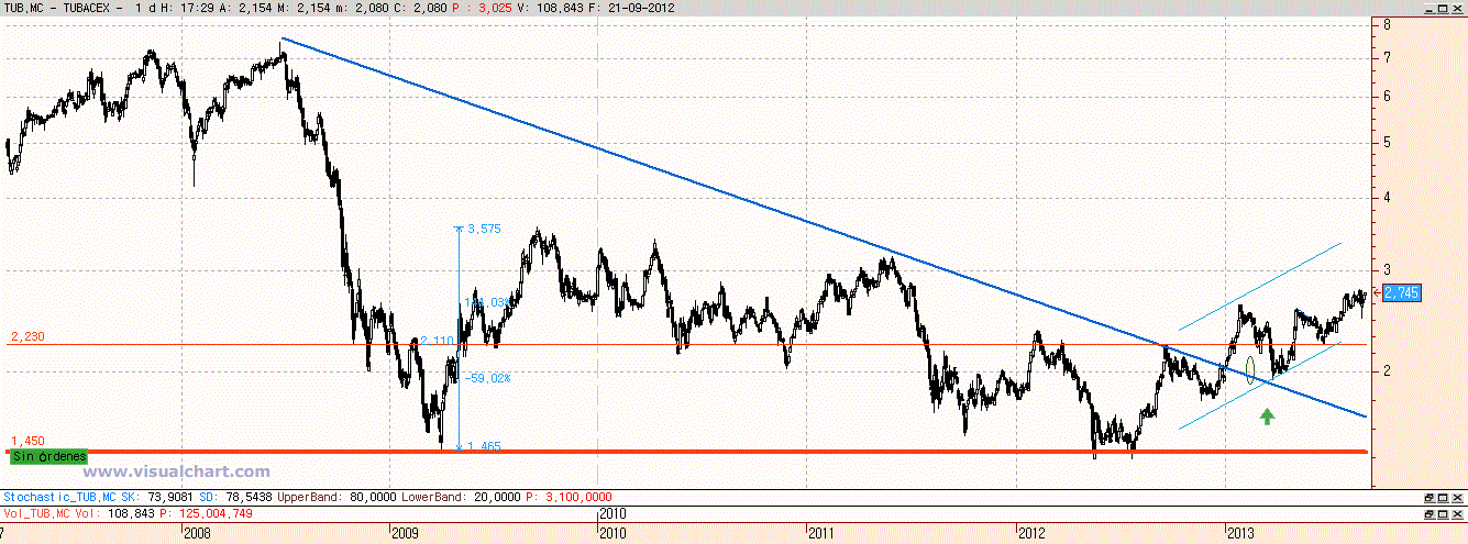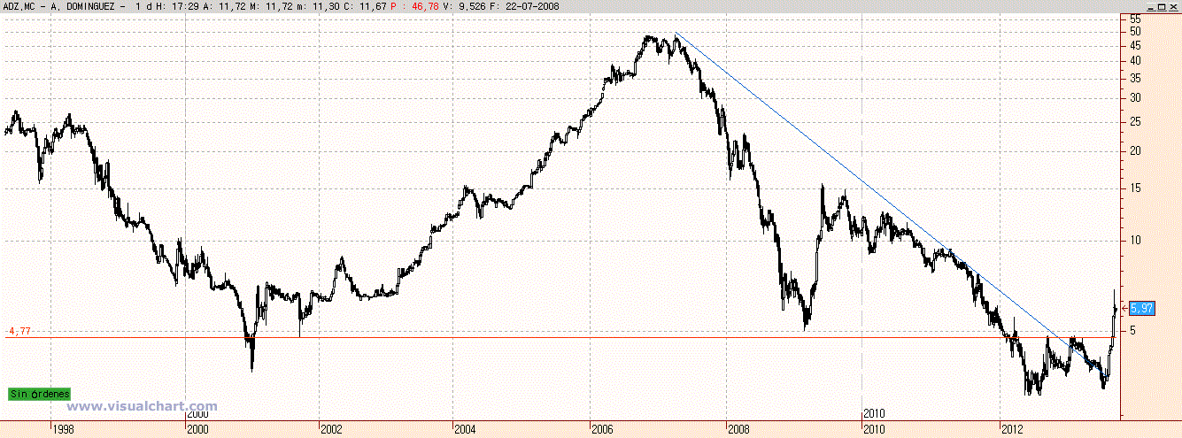 Según estos datos, algunas empresas industriales y de servicios cotizadas en el mercado continuo, están empezando a salir de su tendencia primaria bajista, después de más de cinco años de caídas en su cotización.