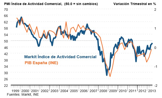 En el mes de agosto se ha registrado el primer crecimiento de la producción manufacturera en España desde abril de 2011. Como podemos ver en el gráfico un valor superior a 50 indica crecimiento mientras inferior significa caída. El mes pasado se puso fin a 27 meses de caída, debido al fuerte aumento de los pedidos para exportaciones, gracias a que se produjo el mayor ritmo de crecimiento de los últimos 32 meses. Además la actividad comercial del sector servicios creció el mes pasado por primera vez desde junio de 2011. El dato anticiparía la salida de la recesión a final de año, aunque la evolución del sector está condicionada a la capacidad de nuestra economía para crear puestos de trabajo.