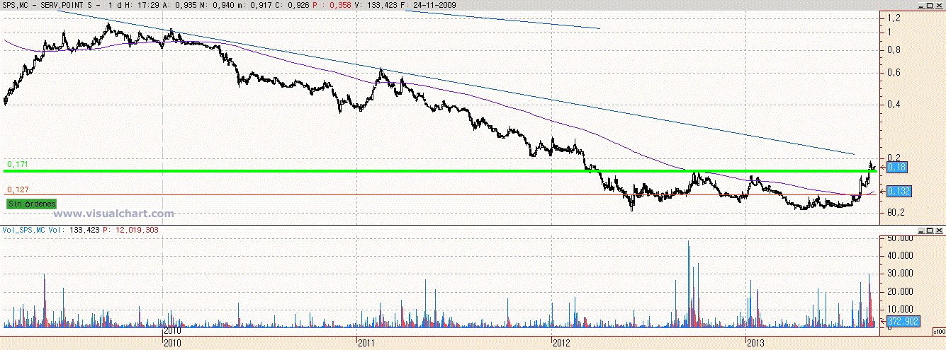 Service Point prevé volver a beneficios este año después de cinco años de pérdidas mediante un duro ajuste de plantilla y nuevas iniciativas empresariales que está siendo bien recibido por su cotización como se aprecia en su gráfico. Se debería confirmar la rotura de la directriz alrededor de 0,2.