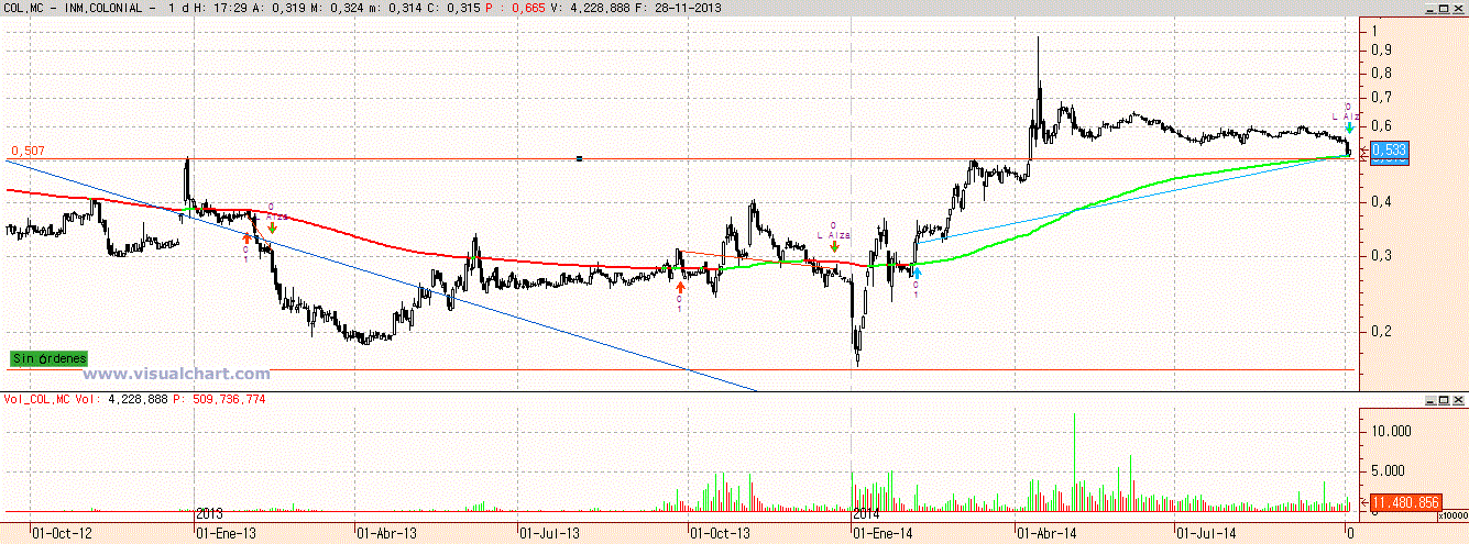 Señal de debilidad, que aunque la media móvil y el soporte han aguantado, la pérdida de los mínimos, hace que el valor pierda atractivo. Nuestro stop estaba en 0,54, y para los más osados, no aguantar por debajo de 0,50.