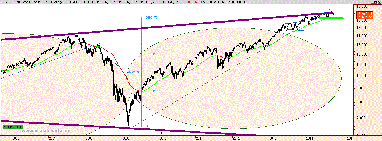 Cuando en bolsa se comenta que hay que dejar correr los beneficios, y cortar las pérdidas, se refiere a este gráfico. Mientras los mínimos sean crecientes, la tendencia es alcista y hay que estar dentro. Mientras esté por encima de los 16300, las bolsas mundiales pueden estar tranquilas.