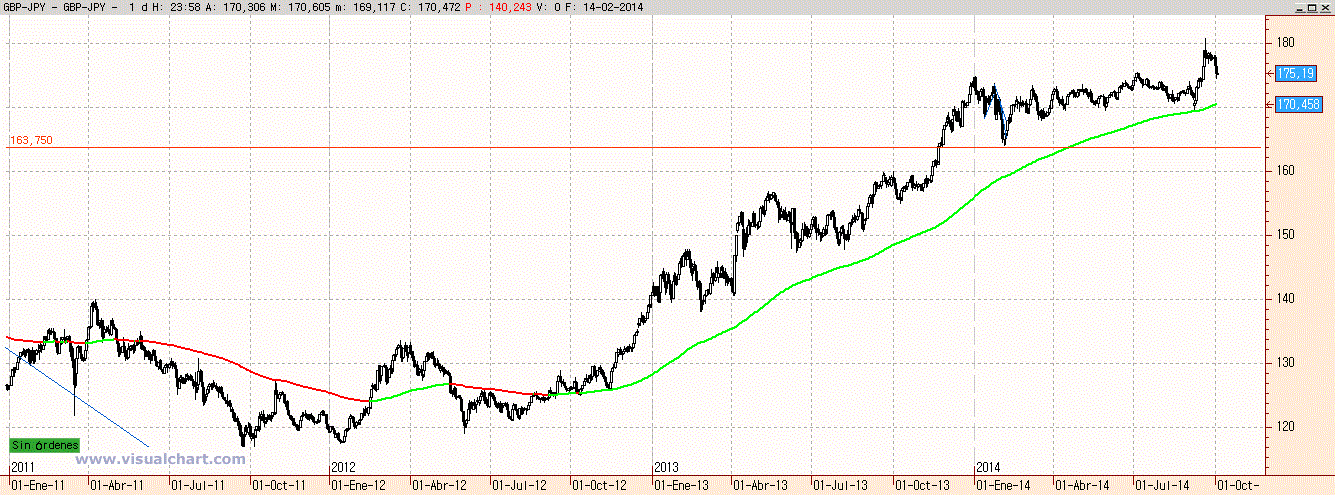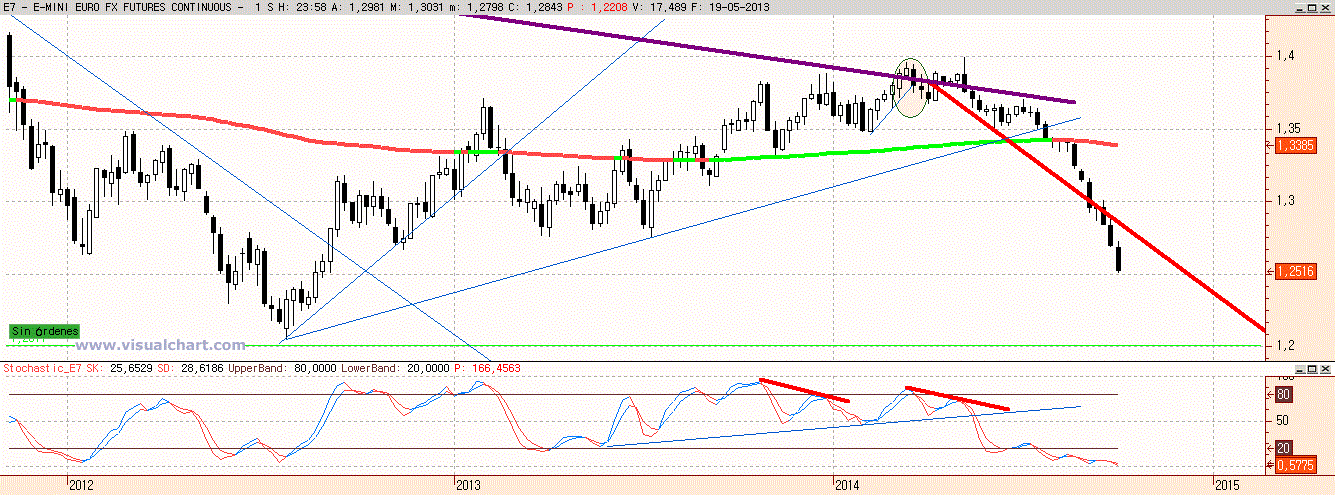 Según mencionamos en “El dolar se pone a tiro” , las divergencias producidas en el entorno del 1,40 han hecho caer hacia 1,25 la cotización del par euro-dólar. Objetivo 1,20€, si bien podría recuperar algo antes de seguir bajando.
