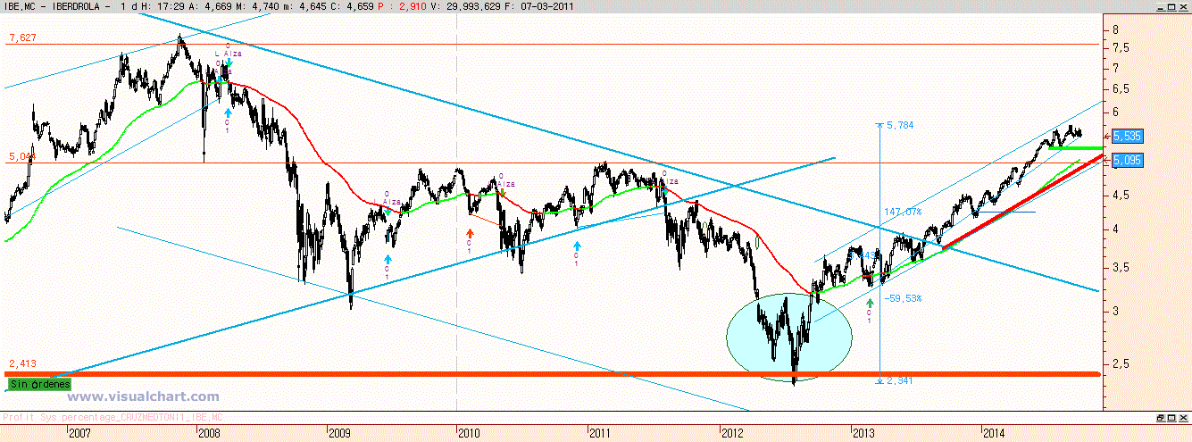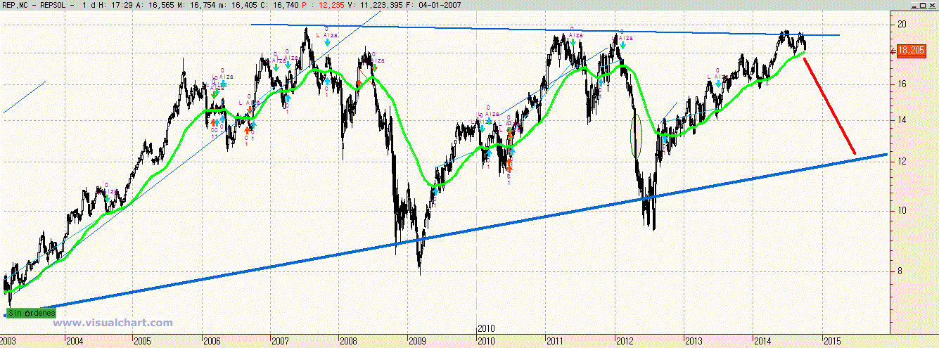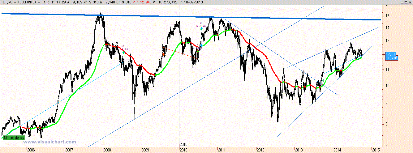 Telefónica mantiene el tipo en la media móvil de 200, en 11,5€, y sigue alcista. Si bien parece que está dibujando una cuña alcista, con implicaciones bajistas. Así que vamos a ceñir el stop en la línea directriz alcista, que coincide con la media móvil.