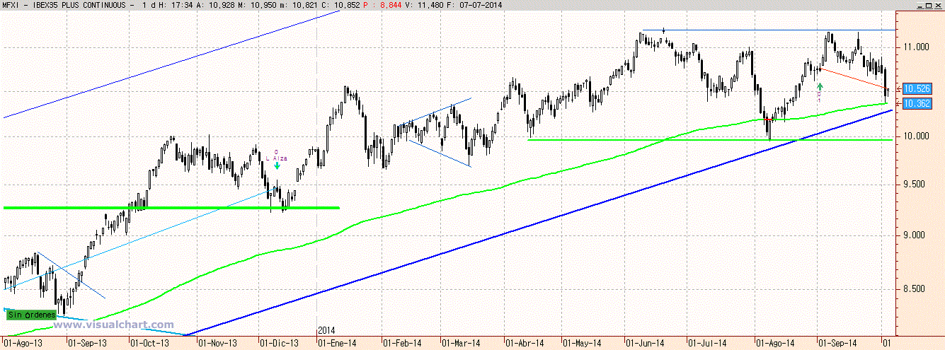 El “revolcón técnico” que ha propinado el Ibex en este último mes, no deja de estar dentro de lo normal dentro de la tendencia alcista en la que está todavía el Ibex 35. El respeto a la línea de tendencia primaria alcista, a la media móvil y a los mínimos crecientes, nos debe hacer mantener posiciones y sólo en el momento que rompamos la resistencia de los 11200, podremos incrementarlas.