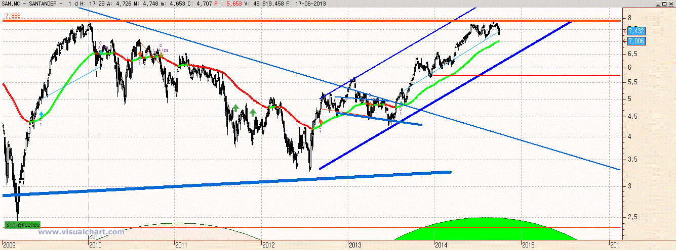 Sin cambios aparentes desde el análisis anterior. Paso despejado hasta los 8 euros conservando si respeta el canal, con stop por debajo de 5,30.