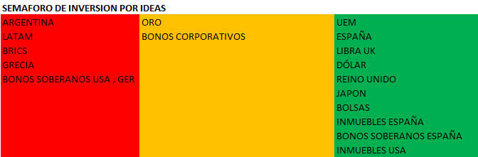 Terminamos como siempre con nuestro semáforo de inversión donde se puede ver de forma resumida nuestra percepción de los diferentes mercados.