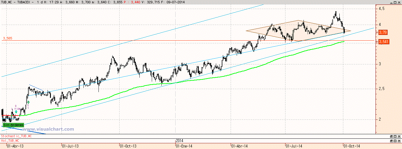 La formación de un diamante produjo una ruptura al alza con una subida en pocos días del 10%, y que el inversor proactivo ha podido aprovechar. Esperemos que respete el canal y la media de 200 sesiones.