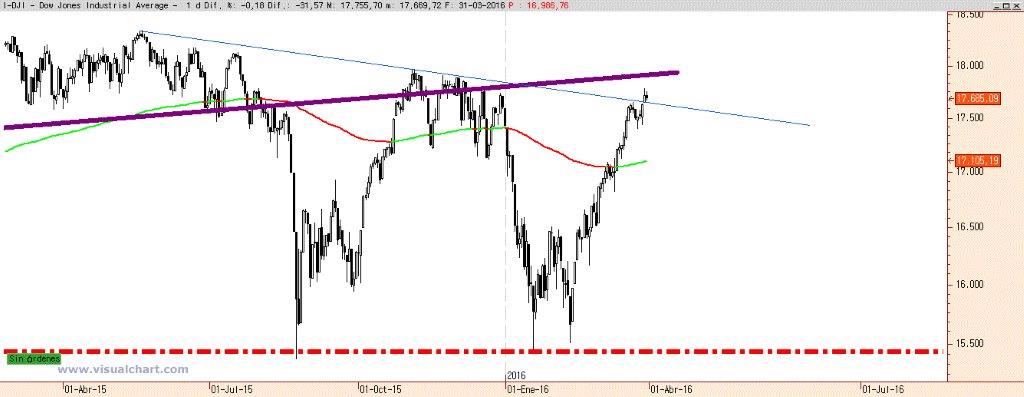 Los índices mundiales están en resistencias, con lo que estamos en un momento delicado tanto para entrar como para salirse. Si vemos el Dow Jones, está en plena resistencia, y debería pasar de los 18.000 para pensar en cotas mayores.