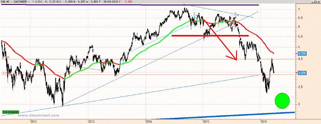 La bajada desde el techo de mercado que hace bajista al valor, podría prolongarse hasta los tres euros, si no superase la resistencia de los 4,5 € que lo convertiría en un valor alcista. Empieza a estar interesante.