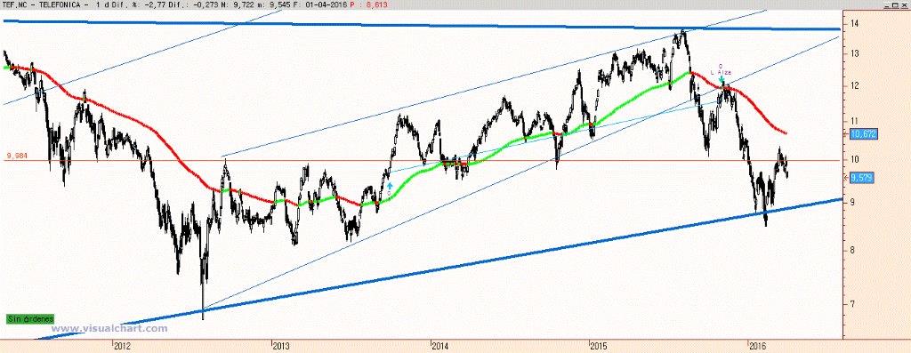 Comentamos: “Finalizado el objetivo bajista de la cuña ascendente, la cotización se está apoyando en la segunda directriz alcista, y puede ser buen momento de compra, con la condición del apoyo en la citada directriz. Se puede especular hasta los 12 euros con suerte, y con stops en la directriz.” Si se ha comprado en directriz, se puede seguir aguantando con los stops pertinentes.